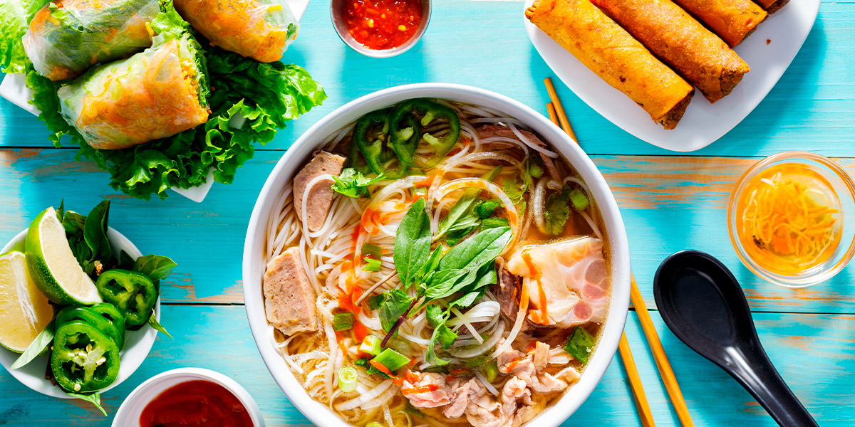 Tradiční Vietnamská polévka, silný vývar s hovězím masem a rýžovými nudlemi