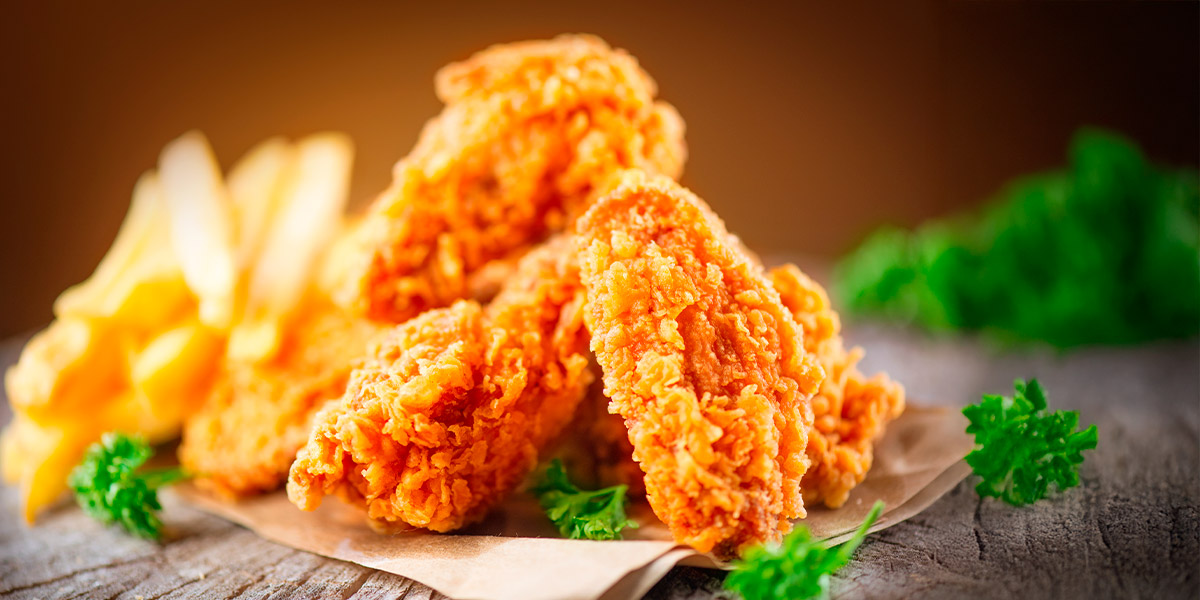 Kyblík s půl kilem kuřecích křídel a půl kilem stripsů + 2x porce hranolek