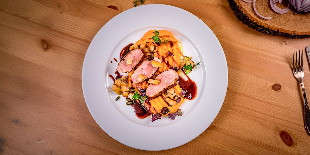 140g masa hovězí mleté maso (řeznictví Chvapil Řisuty), rokfór, nakládaná hruška, majonéza z konfitovaného česneku