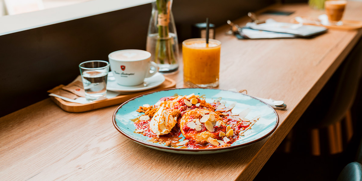 tři lívance, horké maliny, mascarpone, slaný karamel, skořicová drobenka, pražené mandle